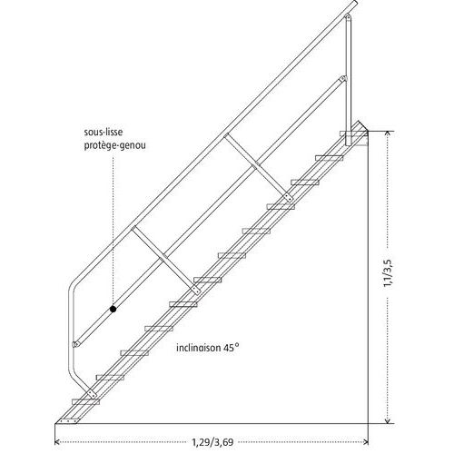 Voorgeboorde trap, klaar om te bevestigen. Treden uitstekend bestand tegen verdraaiingen. Uitgerust met 1 leuning die naar keuze links of rechts kan worden geplaatst. Trap te bevestigen met hoekstukken bovenaan en met winkelhaken op de grond. Product gefabriceerd in Frankrijk. Max. belasting (kg) : 150 Klantgarantie : 5 jaar