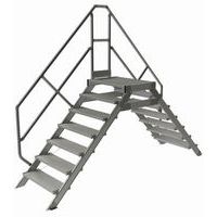 Vaste loopbrug met een hoek van 45° met leuningen. Standaard met 1 leuning die links of rechts kan worden geplaatst. Zeer stabiele loopbrug: de treden zijn aan de lijsten geschroefd. Bevestiging van de loopbrug op de grond met winkelhaken. Platform met leuning aan 1 van de zijden. Product gefabriceerd in Frankrijk.
