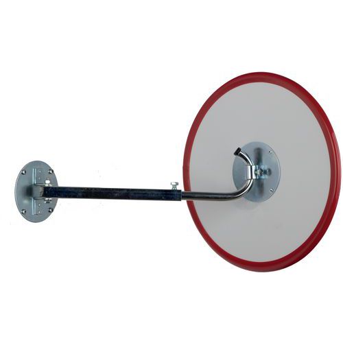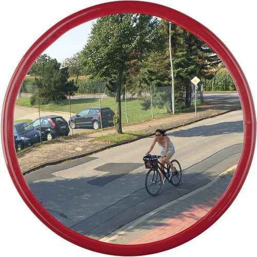 Industriële veiligheidsspiegel voor meer veiligheid in industriegebieden, enz. Bestand en robuust: getest bij harde windstoten van kracht 12 (orkaan groter dan 117 km/u). Vierpuntsbevestiging aan paal of muur met kogelgewricht voor een betere afstelling. Rood kader om de aandacht te trekken. Acrylspiegel: sterker dan glas. Uitstekende beeldfeedback zonder vervorming. Eenvoudig te installeren.