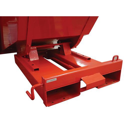 Het automatisch kantelen gebeurt door een drukplaat aan de voorkant van de vorksleuven. Het kantelen kan ook worden uitgevoerd door middel van een handmatige ontgrendeling met een kabel. Dit kan rechtstreeks vanuit de heftruck worden uitgevoerd. Uitstekende stevigheid van het geheel dankzij het geprofileerde en versterkte frame. Het plaatstaal is doorlopend gelast. Inrijkokers vorken 230 x 100 mm / RAL 2002. Wielen en deksel verkrijgbaar als optie. Deze container SBA-SERIES is een van de meest stabiele producten op de markt dankzij de uitstekende gewichtsverdeling. De containers SBA-SERIES kunnen dankzij hun chassis dat voldoet aan de Europese normen door een pallettruck worden verplaatst.
