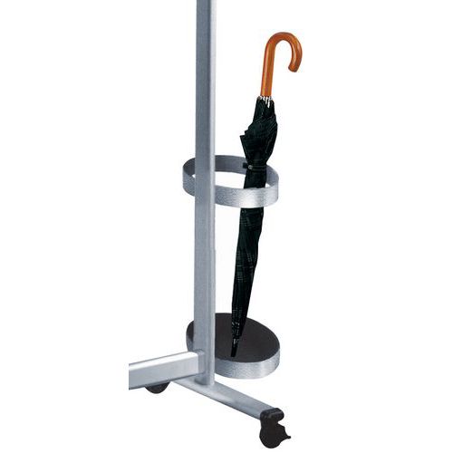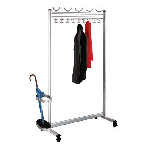 Kapstok van hoge kwaliteit van aluminium, met zeer hoge capaciteit. Garderoberek met haken voor hoeden en kledingstukken. De kapstok is verrijdbaar dankzij 4 wielen die afzonderlijk geblokkeerd kunnen worden. De paraplubak kan naar keuze rechts of links gemonteerd worden.