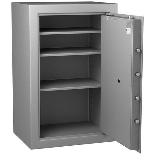 Kluis Vulcain-serie van 40 tot 205 liter. Anti-inbraakbeveiliging conform de Duitse norm VDMA niveau B. Vergrendelingssysteem met mangaanbepantsering tegen doorboring. In hoogte verstelbaar legbord. Verankeringsgat in de onderkant, ø14 mm. Bezorging op afspraak met bedrijfsklaar maken bij de klant en afvoer van verpakkingsmateriaal voor recycling. Begane grond met maximaal 2 treden of verdieping met lift. Maximaal 20 meter rijden. Neem voor alle speciale verzoeken met betrekking tot de levering contact op met onze klantenservice (moeilijk toegankelijke plaatsen, steile hellingen, zachte grond).