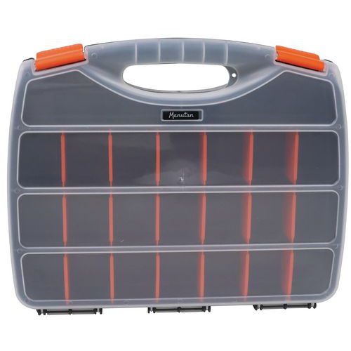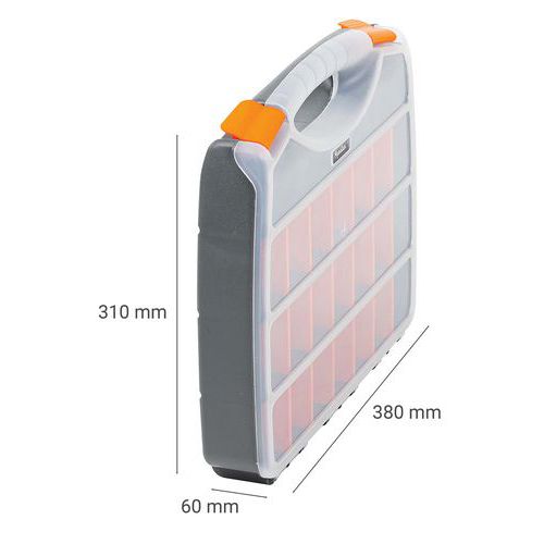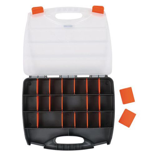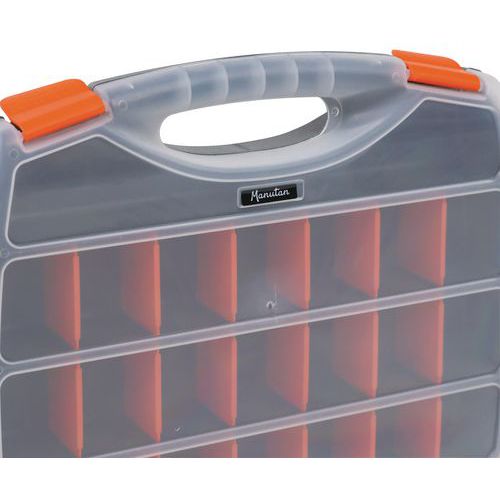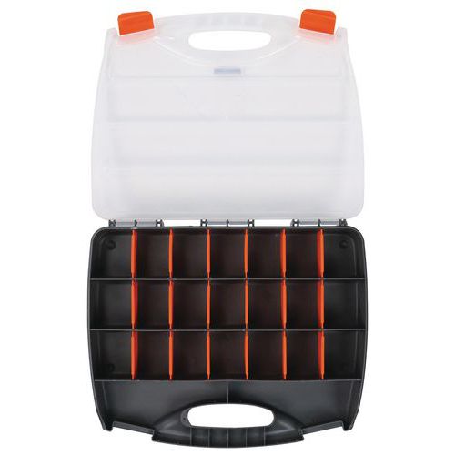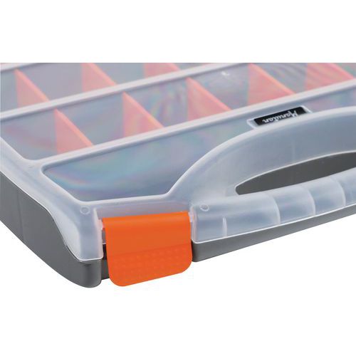 Koffer met tussenschotten, eenvoudig te verplaatsen met 2 sluitingen ter hoogte van de handgreep. De vakken kunnen in 25 kleine vakken worden verdeeld met verwijderbare tussenschotten. Transparant deksel om snel te zien wat erin zit.