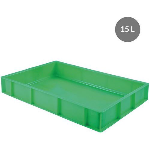 Dichte kist 600x400. Voor catering en restaurants: opslagkist voor grondstoffen. Stapelbaar met en zonder deksel, grote capaciteit voor stapelen in hoogte. Platte bodem waarop geen resten achterblijven, eenvoudig te reinigen.