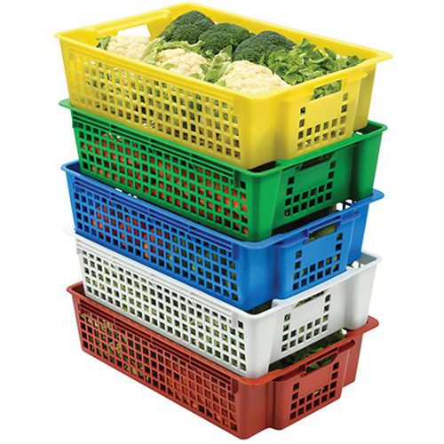 Geperforeerde stapelbare nestbare krat. Lichte krat. Geïntegreerde ergonomische praktische handvatten om praktisch vast te grijpen. Stapelbaar tot 2m. Stapelbaar en nestbaar door een halve slag te draaien met de richtingaanwijzer.