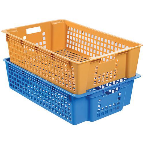 Geperforeerde stapelbare nestbare krat. Lichte krat. Geïntegreerde ergonomische praktische handvatten om praktisch vast te grijpen. Stapelbaar tot 2m. Stapelbaar en nestbaar door een halve slag te draaien met de richtingaanwijzer.