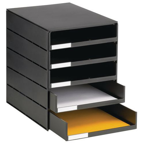 Duurzame opbergmodule met 5 laden Styroval Pro Eco met geringe buitenafmetingen (243 mm breed). Geschikt voor kasten en legplanken. Leverbaar met schuifladen, open of goed afgesloten, voor het opbergen van documenten tot C4-formaat. Styroval Pro Eco is een opbergsysteem waarvan de buitenafmetingen slechts weinig groter zijn dan het binnenvolume van de laden. Het maakt optimaal gebruik van de beschikbare ruimte Styroval is onmisbaar overal waar ruimte schaars is.