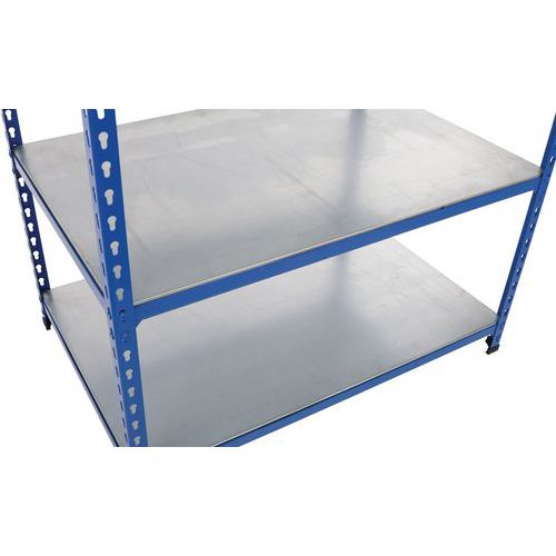Industriële stelling, eenvoudig en robuust voor het opslaan van middelzware artikelen. Dicht stalen legbord, perfect voor een magazijn voor losse onderdelen en/of vette producten. Verzinkte afwerking voor vochtige ruimtes of grijs/blauwe epoxyverf voor droge omgeving. Magazijnlegbord, eenvoudig en zonder technici of specifiek gereedschap te monteren.