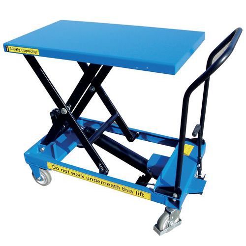 Gemakkelijk te verrijden dankzij de duwbeugel. Bedieningspedaal om het laadvlak omhoog of omlaag te brengen. 4 wielen van polyurethaan, waarvan 2 zwenkwielen. Afgewerkt in blauwe epoxylak.