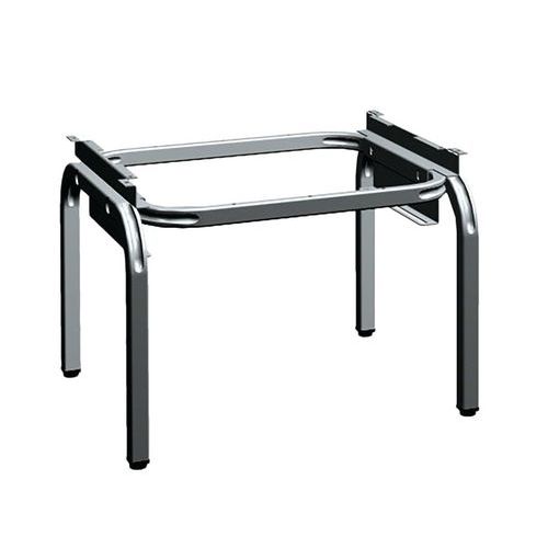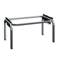 Bladloze, stalen buisvoet voor Seamline® garderobe. Poten met niet-vlekkende eindkappen, met steunen. Bladloos onderstel in gebogen stalen buis met Amerikaanse elleboog, dikte 1,5 mm: 2 dwarsstukken 30 x 30 mm en 2 langsliggers 30 x 20 mm. Voeten met vijzels: slag 20 mm.