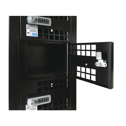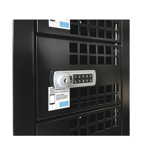 Elektrische oplaadkast voor smartphones. Robuust met body en geperforeerde deur van elektrolytisch verzinkt plaatstaal. Elektrische voeding 230 V klassiek en verbruik 40 W. Elektronisch slot met 4-cijferige code in instelmodus. Muurbevestiging mogelijk met 4 voorgeboorde gaten. Kast met mooie afwerking, epoxylak, 8 kleuren naar keuze. Praktisch met instructielabel op elke deur.