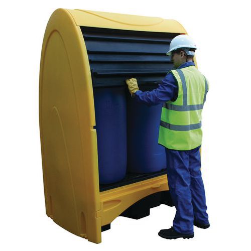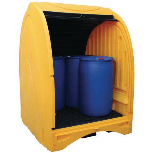 Let op: de boxen voor 4 vaten moeten nog worden gemonteerd. Kan worden vergrendeld met een hangslot (met U-vormige beugel, lengte 80 mm). Kan in de ondergrond worden verankerd dankzij 4 inwendige inkepingen. (Bouten niet meegeleverd.) Vergeet niet om uw oprijplaten voor de opslagboxen te bestellen.