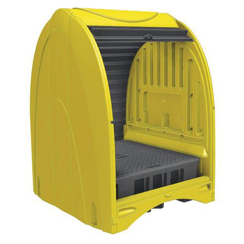 Let op: de boxen voor 4 vaten moeten nog worden gemonteerd. Kan worden vergrendeld met een hangslot (met U-vormige beugel, lengte 80 mm). Kan in de ondergrond worden verankerd dankzij 4 inwendige inkepingen. (Bouten niet meegeleverd.) Vergeet niet om uw oprijplaten voor de opslagboxen te bestellen.