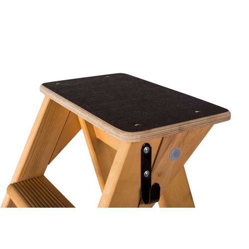 Professionele trapladder van hout 1 plank. Legbord 370 x 230 x 15 mm van multiplex met antislipcoating. Haak aan de zijkant voor het ophangen van een emmer of gereedschapstas. Grote gegroefde treden (95 mm, dikte: 23 mm). Brede vastgeschroefde antislipvoeten. Stalen openingsmechanisme met geïntegreerde vergrendeling. Hout met laserafwerking voor uv-bescherming. Max. belasting (kg) : 150 Klantgarantie : 2 jaar