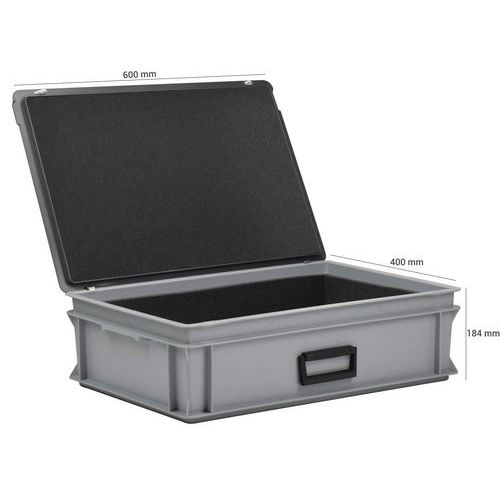 Gereedschapskoffer met klep en 2 versterkte scharnieren. Te vergrendelen met 2 kliksluitingen met veer. Stapelbaar, zonder risico van wegglijden. Perfect te onderhouden door de gladde wanden. Kunststof koffer met draagbeugel aan de lange zijde. Etikethouders op 1 grote en 1 kleine zijde.
