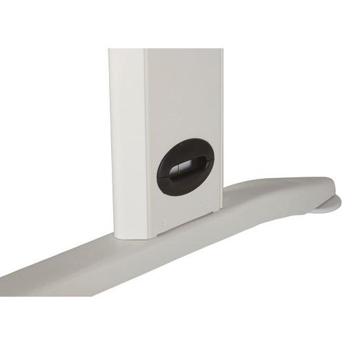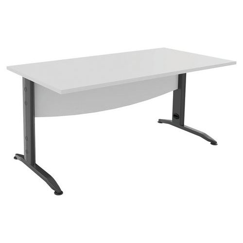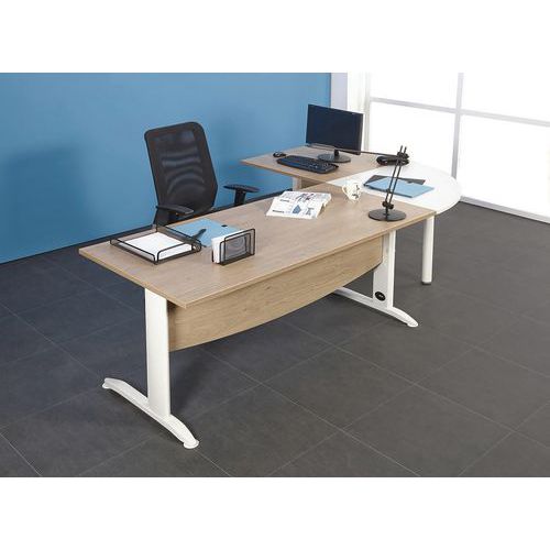 Metalen constructie met epoxylak. Gemelamineerd blad, dikte 25 mm. Voorzien van een frontpaneel van spaanplaat met een dikte van 16 mm in gebogen vorm Metalen L-vormig onderstel met stelpoten. Franse makelij. Monteerklaar geleverd met handleiding
