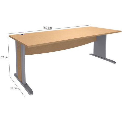 Blad van spaanplaat, dikte 25 mm, hoogte 72 cm. L-poten van massief hout met zeefdruk en stelpoten. Gebogen frontpaneel met een dikte van 16 mm voor kabeldoorgangen. Blad van spaanplaat met een hoogte van 72 cm, 25 mm dik, gemelamineerd. Schokbestendige randen. Monteerklaar geleverd met handleiding Aan te vullen naar keuze met een uitbreidingsblad met poten, een ladeblok op bureauhoogte of een uitbreiding in waterdruppelvorm.