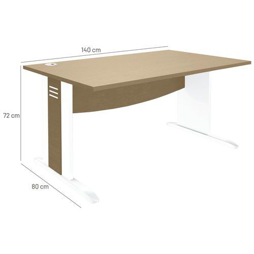 Blad van spaanplaat, dikte 25 mm, hoogte 72 cm. L-poten van massief hout met zeefdruk en stelpoten. Gebogen frontpaneel met een dikte van 16 mm voor kabeldoorgangen. Blad van spaanplaat met een hoogte van 72 cm, 25 mm dik, gemelamineerd. Schokbestendige randen. Monteerklaar geleverd met handleiding Aan te vullen naar keuze met een uitbreidingsblad met poten, een ladeblok op bureauhoogte of een uitbreiding in waterdruppelvorm.