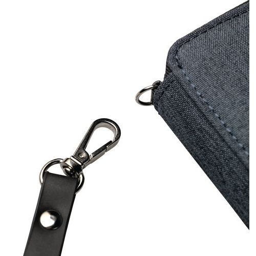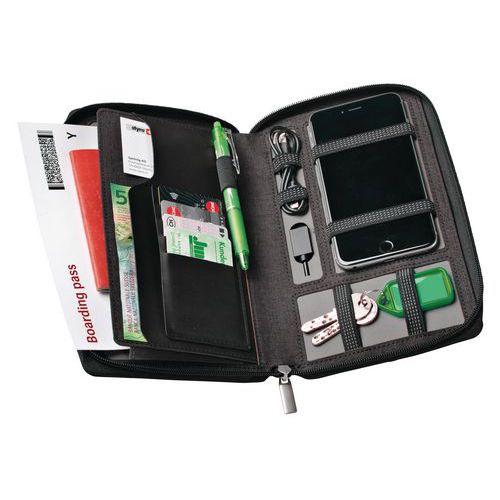 Uitgerust met verschillende vakken (pasjes, paspoorten, smartphone (6)...), een ritssluiting en een afneembare draagband.