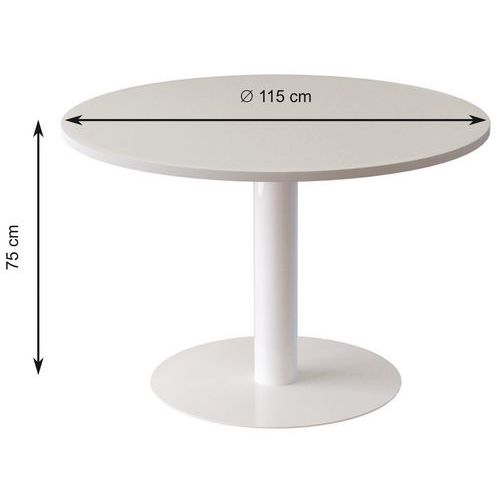 Gemelamineerd blad met dikte 25 mm Afgewerkt met een dikke rand van ABS van 2 mm, diameter 115 cm Stalen voet met witte epoxylak, krasbestendig, diameter 120 mm Stalen sokkel met witte epoxylak, krasbestendig, diameter 62 cm, dikte 4 mm Logistiek: ongemonteerd geleverd