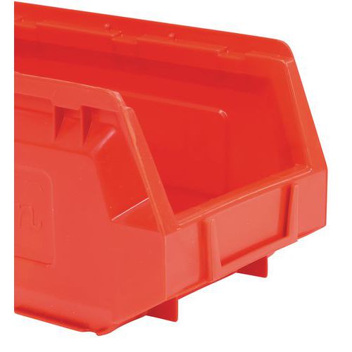 Randen met blokkering voor meer stabiliteit bij het stapelen. Grote stevigheid dankzij de zijdelingse groeven. Platte en slipvaste bodem voor het gemakkelijk vastpakken. Ligt uitstekend in de hand door de handgreep aan de voorkant. Zeer schokbestendige kunststof bak. Gemakkelijke identificatie door de etikethouder.