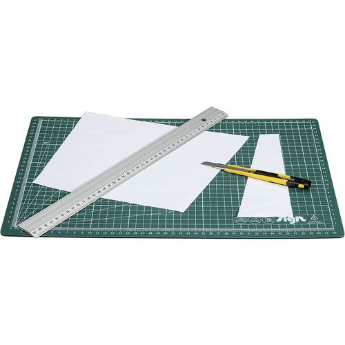 Multifunctionele snijplaat, niet-toxisch door materiaal zonder DEHP. 3 lagen met verschillende textuur: 2 TPE-lagen (buitenkant) en 1 PP-laag (binnenkant). Zelfdichtend oppervlak HQ: het mes wordt in rubber gestoken en komt eruit zonder sporen. Nauwkeurig en zeer eenvoudig snijden met geruit lemmet van 5 x 5 cm en vooraf vastgestelde hoeken.