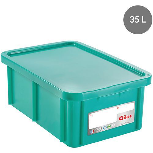 Stapelbare bak met deksel conform de HACCP-procedure inzake de bewaring van levensmiddelen. Betrouwbare en gemakkelijk uitwisbare markering dankzij het geïntegreerde IML-etiket. Verzonken handgrepen voor een betere hantering. Nestbaar zonder deksel. Ontwerp waarop geen resten achterblijven. Machinewasbaar. Compatibel met alle Gilac-sokkels met 4 en 6 wielen.