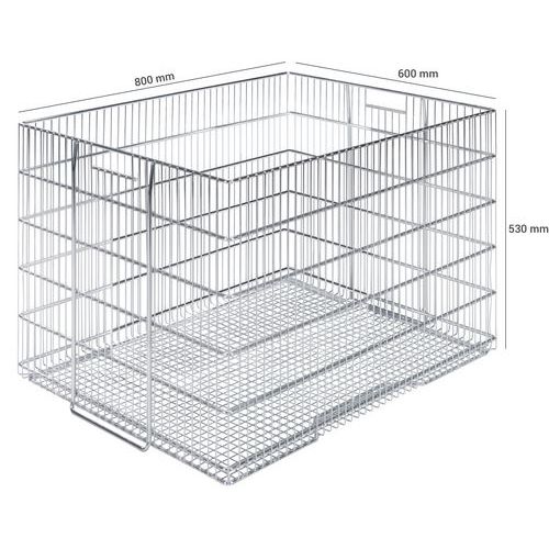 | Productnaam | Stapelbare bak van staaldraad, Totale inhoud: 53 L, Totale hoogte: 530 mm, Totale breedte: 600 mm |