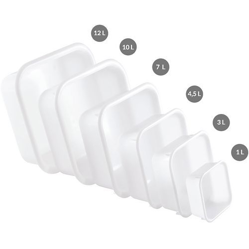 Teil geschikt voor levensmiddelen. Zeer goede mechanische en chemische weerstand. Duurzaam. Zeer gemakkelijk schoon te maken. Nestbaar zonder zuignap-effect dankzij de lippen. Voorzien van randen om de producten gemakkelijker te kunnen grijpen. Culinair Max. belasting (kg) : 12 kg