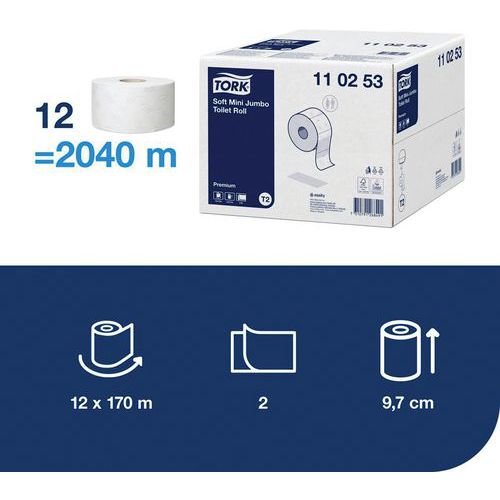 Toiletpapier Mini en Maxi Jumbo Tork Premium, Aantal vouwen: 2, Lengte rol: 1700 cm, Kleur: Wit, Type: T2 Toiletpapier Mini en Maxi Jumbo Tork Premium, Aantal vouwen: 2, Lengte rol: 1700 cm, Kleur: Wit, Type: T2