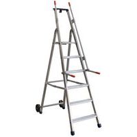 Professionele trapladder met 2 veiligheidsleuningen. Inklapbare handgrepen voor het optillen van de poten van de staanders. Scharnieren van aluminium die zorgen dat de ladder niet sluit of verder spreidt. Kantelwielen die geactiveerd worden na het optillen van de poten van de staanders.