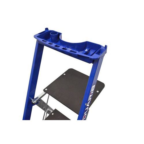 Trapladder van gelakt aluminium met neerklapbare emmerhouder voor een emmer van 15 l (maximaal 25 kg). Groot gereedschapsbord met twee geïntegreerde haken. Treden hamdatig aan de staanders gelast voor een betrouwbare bevestiging. Antisliptreden met antisliprooster van 100 mm breed, comfortabel en eenvoudig te reinigen. Eenvoudig en snel te plaatsen en op te bergen.