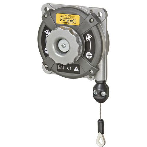 Veerbalancer Zeca met behuizing van gegoten aluminium. Traploze instelling van de lading, van de maximum- tot de minimumwaarde. Lengte van de kabel is eenvoudig in te korten voor aanpassing aan elke behoefte. Vier ophangpunten en drie verankeringspunten.