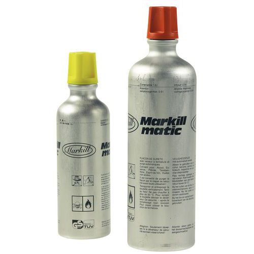 Veiligheidsfles met een klep die wordt geopend door erop te drukken.