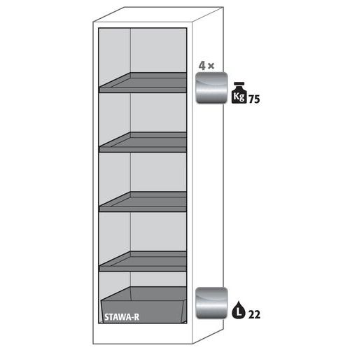 Veilige opslag, voldoet aan de geldende regelgeving voor gevaarlijke, ontvlambare producten in werkruimtes Robuust en duurzaam: stevige constructie aan de buitenzijde van brandwerende platen met een coating van melaminehars 3 bevestigingsscharnieren per deur, volledig sluitmechanisme en beveiligingselementen ter bescherming tegen corrosie, gemonteerd buiten de opslagruimte hoogwaardige deur, krasbestendig, met gestructureerd oppervlak met epoxy-coating Ergonomisch: de deur blijft in de stand staan bij het openen, automatische sluiting in geval van brand Gecontroleerd gebruik: vergrendelbare deur, compatibel met centrale vergrendeling Eenvoudig transport: geïntegreerde transportsokkel, eenvoudig afgewerkte plint of plint met 4 nivelleringsvoeten optioneel beschikbaar Beluchting en ontluchting: ingebouwd beluchtings- en ventilatiesysteem voor aansluiting (diameter 75 mm) op een technisch luchtafvoersysteem Getest en gecertificeerd conform de Amerikaanse norm FM 6050 - Gemaakt in Duitsland Max. belasting (kg) : 600 kg