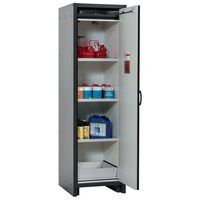 Veilige opslag, voldoet aan de geldende regelgeving voor gevaarlijke, ontvlambare producten in werkruimtes Robuust en duurzaam: stevige constructie aan de buitenzijde van brandwerende platen met een coating van melaminehars 3 bevestigingsscharnieren per deur, volledig sluitmechanisme en beveiligingselementen ter bescherming tegen corrosie, gemonteerd buiten de opslagruimte hoogwaardige deur, krasbestendig, met gestructureerd oppervlak met epoxy-coating Ergonomisch: de deur blijft in de stand staan bij het openen, automatische sluiting in geval van brand Gecontroleerd gebruik: vergrendelbare deur, compatibel met centrale vergrendeling Eenvoudig transport: geïntegreerde transportsokkel, eenvoudig afgewerkte plint of plint met 4 nivelleringsvoeten optioneel beschikbaar Beluchting en ontluchting: ingebouwd beluchtings- en ventilatiesysteem voor aansluiting (diameter 75 mm) op een technisch luchtafvoersysteem Getest en gecertificeerd conform de Amerikaanse norm FM 6050 - Gemaakt in Duitsland Max. belasting (kg) : 600