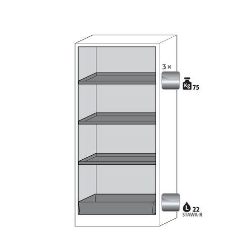 Veilige opslag, voldoet aan de geldende regelgeving voor gevaarlijke, ontvlambare producten in werkruimtes Robuust en duurzaam: Stevige constructie aan de buitenzijde van brandwerende platen met een coating van melaminehars 3 bevestigingsscharnieren per deur volledig sluitmechanisme en beveiligingselementen ter bescherming tegen corrosie, gemonteerd buiten de opslagruimte hoogwaardige deur, Krasbestendig, met gestructureerd oppervlak met epoxy-coating Ergonomisch: de deur blijft in de stand staan bij het openen, automatische sluiting in geval van brand Gecontroleerd gebruik: vergrendelbare deur, compatibel met centrale vergrendeling Eenvoudig transport: geïntegreerde transportsokkel, eenvoudig afgewerkte plint of plint met 4 nivelleringsvoeten optioneel beschikbaar Beluchting en ontluchting: ingebouwd beluchtings- en ventilatiesysteem voor aansluiting (diameter 75 mm) op een technisch luchtafvoersysteem Getest en gecertificeerd conform de Amerikaanse norm FM 6050 Beluchting en ventilatie: Beluchting en ventilatiesysteem voor aansluiting op een autonoom afzuig- of gefilterd ventilatiesysteem, helix op het uitblaasrooster dat ventilatie aangeeft Gemaakt in Duitsland Max. belasting (kg) : 600 kg
