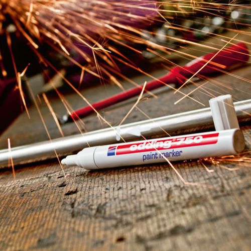 Markeerstift verf - Edding 750 voor een zeer dekkend en permanent schrift, zelfs op donkere of transparante materialen. Markering op metaal, glas, kunststof, etc. en in het bijzonder op alle gladde oppervlakken. Verf droogt snel, reukloos. Water-, licht- en hittebestendig tot 400 °c (1000 °C voor bepaalde kleuren zoals wit, geel, zilverkleurig) en bestand tegen afschuring. Door ventiel gecontroleerde inktstroom.