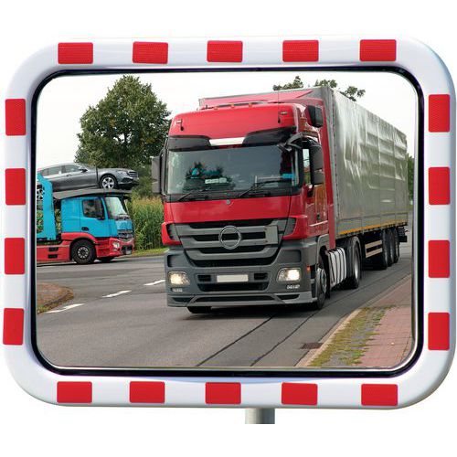 Verkeersspiegel polycarbonaat met rood/wit frame, Bewakingsradius: 22 m, Vorm: Rechthoek Verkeersspiegel polycarbonaat met rood/wit frame, Bewakingsradius: 22 m, Vorm: Rechthoek
