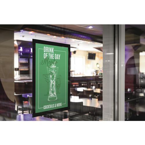 Lijst voor de weergave van prijsdocumenten, openingstijden, acties, enz. Lijst voor mededelingen Duraframe® Sun, speciaal ontworpen voor glazen oppervlakken waar de zon op schijnt. Dankzij de vitrostatische bevestiging kan de lijst op vitrines, ramen, enz. worden bevestigd. Snel plaatsen en verwisselen van de affiche dankzij de magnetische omlijsting. Hittebestendig (tot 70°C) en is voorzien van een UV-bestendige laag die tot 2 jaar blijft zitten.