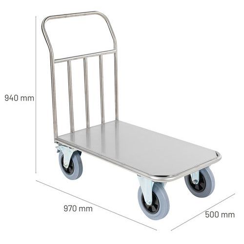 Wagen van RVS met vaste duwbeugel, Max. belasting: 500 kg, Totale hoogte: 940 mm, Totale breedte: 500 mm Wagen van RVS met vaste duwbeugel, Max. belasting: 500 kg, Totale hoogte: 940 mm, Totale breedte: 500 mm