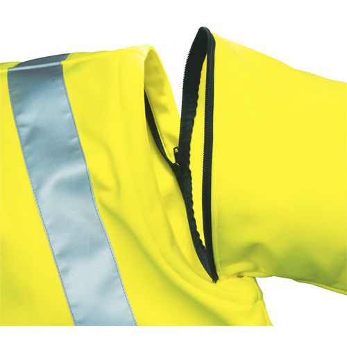 Ritssluiting tot aan de bovenrand van de kraag. Elastische boorden aan de pols met klittenband. Rugbescherming. Vest met verwijderbare manchetten. Veel zakken. Aanspanning door middel van een elastiek met koordhouders. Reflecterende stroken 3M™ Scotchlite™. Rechte gevoerde kraag. CE