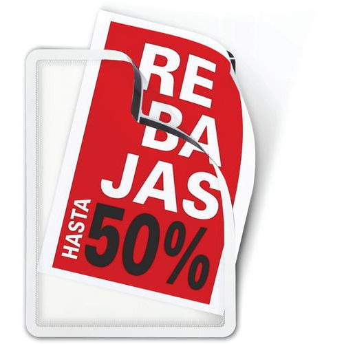 Dubbelzijdige, zelfklevende documenthoes met opdruk en stippendesign. Sluiting met 3 zelfklevende strips: de documenten blijven perfect zitten. Dubbelzijdige weergave op glas dankzij het kader dat aan twee zijden te zien is. Gebruik in twee richtingen: staand of liggend. Hoes speciaal voor grote formaten.