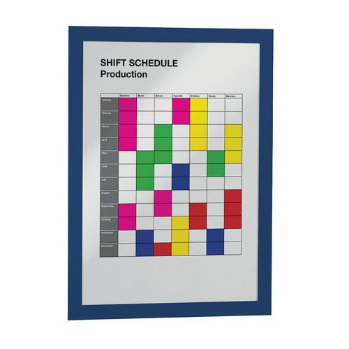 Zelfklevende wissellijst Duraframe® voor glad oppervlak. Dankzij de verplaatsbare zelfklevende achterkant hecht de lijst op alle gladde en harde oppervlakken, zoals muren, deuren, enz. Op een glazen oppervlak is de inhoud aan voor- en achterzijde af te lezen. Eenvoudig en snel actualiseren van informatie, documenten blijven stevig zitten dankzij de magnetische omlijsting. Kan staand of liggend worden gebruikt. De ideale oplossing voor het weergeven van algemene en verplichte bedrijfsinformatie, aanbiedingen, interne regelgeving, mededelingen, enz. Gemaakt in de EU Klantgarantie : 2 jaar