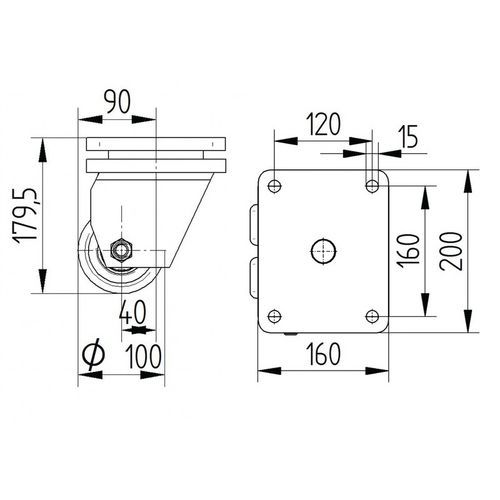 Zwenkwiel, vork en plaat staalgelast, verzinkt chromatiseerd, zwenklager voorzien van axiaal kogellager en kegellager, geschroefd en geborgd, met smeernippel, wielas geschroefd, plaatbevestiging. Wielkern van polyamide, wielnaaf op precisiekogellager, extra zware Heavy Duty uitvoering