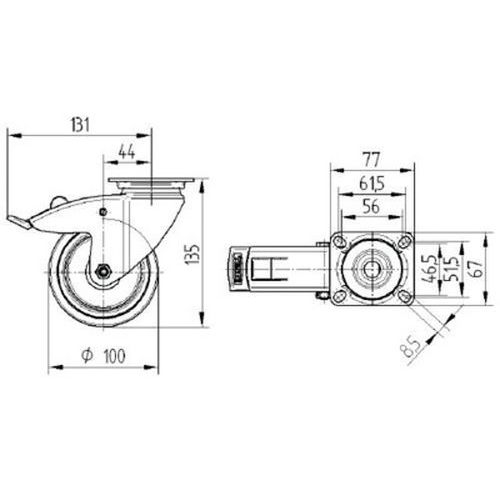 Zwenkwiel, vork en plaat staalgelast, verzinkt chromatiseerd, zwenklager voorzien van axiaal kogellager en kegellager, geschroefd en geborgd, met smeernippel, wielas geschroefd, plaatbevestiging. Wielkern van polyamide, wielnaaf op precisiekogellager, extra zware Heavy Duty uitvoering