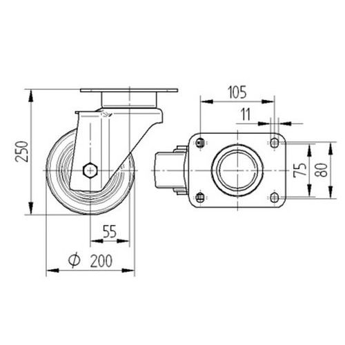 - Zwenkwiel met dubbele rem, vork van zware geperste staalplaat, blauwverzinkt-chromatiseerd, zwenklager met afgedekt precisiekogellager, wielas geschroefd, plaatbevestiging.