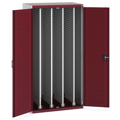 Werkplaatskast voor het overzichtelijk opbergen van uw gereedschap. Voorzien van perfogaten en sleufpanelen. Sluit de deuren veilig af met de driepuntssluiting en het cilinderslot.