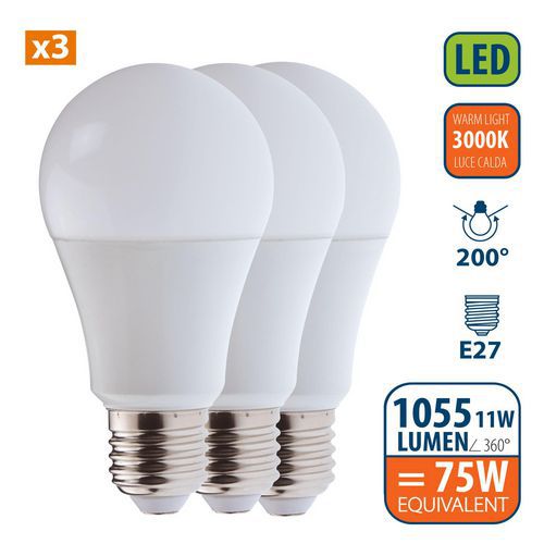 | Productnaam | Set van 3 ledlampen standaard E27 11 W, Lichtstroom: 1055 lm, Type fitting: E27, Lichtkleur: Warm wit |