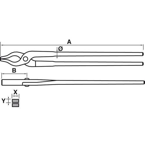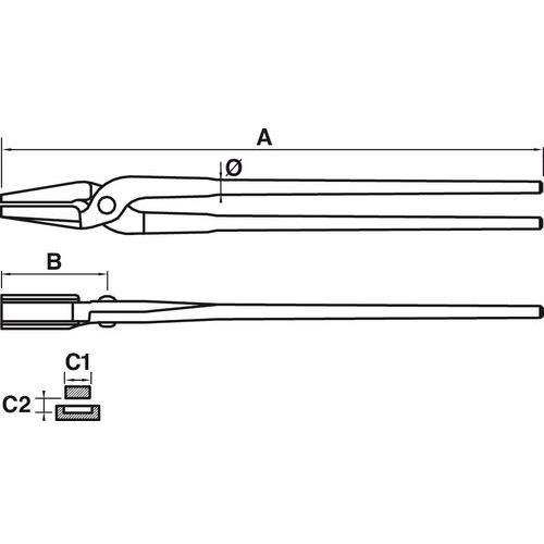 Smeedtang, plat gesloten, in koolstofstaal, werkoppervlak fijn gepolijst na warmtebehandeling. Gebruikt voor smeden en bewerken van staal.